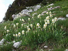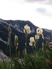 Two other species occur on Mt. Orjen, Iris pseudopallida Trinajstic and Iris reichenbachii var. bosniaca (now classified as a synonym of Iris spuria,[3]), both with equal chromosome numbers (2n=24), same as Iris orjenii.[1] I. orjenii appears somewhat intermediate, in height of stem, colour of flowers and consistence of spathes. The shape of the tepals is different from I. pseudopallida but similar to those of I. reichenbachii var. bosniaca. The spathe dries out before or during flowering time, getting white to slightly brownish, sometimes with a violet teint, a diagnostic feature for the whole Pallida series, whereas in I. reichenbachii the spathe is sharply keeled and stays completely green until flowering period is over. Shape of seed, a character regarded to be of high diagnostic value reveals similarity to those of Iris cengialti and Iris illyrica, both closely related to I. pseudopallida, but striking dissimilarities to the latter, which has compressed seeds. Seeds of I. reichenbachii are described to be similar to those of I. orjenii. Shape and undulation of falls and standards are much more similar to I. reichenbachii, whereas no white flowered individuals from wild population of this species have been reported. White flowering plants of I. pallida from the region of Dubrovnik and white flowering individuals have been spotted occasionally in bigger populations in southern Dalmatia. A hybrid origin of I. orjenii might be suspected, the more as it is found exactly at the height where areals of I. pseudopallida and I. reichenbachii potentially overlap. Thus the closest I. orjenii population was seen only 2 km from a remote I. pseudopallida locality and I. reichenbachii is found in the immediate vicinity of all known stands of I. orjenii. The morphological homogeneity of I. orjenii and the ecological specialisation also favour exclusion of a spontaneous hybrid population hypothesis. I. orjenii is fully fertile and generative propagation in situ has been examined. The new species is restricted to humid chromic luvic cambisols in the high altimediterranean level. The eu- to supramediterranean I. pseudopallida in contrast is widespread on bare limestones or initial rendzic leptosols (Rendzina) in a variety of mediterranean and submediterranean alliances of coastal karst plains, on megacliffs in the Ephedero-Cyxthoselinetum palmoidis alliance and on montane limestone escarpments in the Campanula-Moltkeetum petaeae H-Iċ alliance. I. reichenbachii var. bosniaca and I. orjenii have strong affinities in their phytosociological character as they are constituents of Festuco-Seslerietea Barbéro & Bonin 1969 with I. reichenbachii var. bosniaca common in Seslerietalia juncifoliae H-at and Crepedetalia dinaricae Lksic. associations on shallow rendzic leptosols of Dinaric high altitudinal limestone pastures and Pinion heldreichii alliances. But ecological differences exist as I. orjenii is never found on extremely shallow soils. Concluding from both morphology and ecology, a hybrid origin followed by speciation seems the best explanation for the restricted occurrence of I. orjenii.