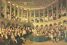 The original, domed House of Commons chamber was destroyed by fire in the 1790s, and a less elaborate new chamber, without a dome, was rebuilt in the same location and opened in 1796, four years before the Parliament's ultimate abolition.