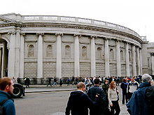 The building underwent extensions by architect James Gandon, as Pearce had died. Gandon was responsible for three of Dublin's finest buildings, the Custom House, the Four Courts and the King's Inns. Between 1785 and 1789 he added a new peers' entrance at the east of the building, facing onto Westmoreland Street. Unlike the main entrance to the south, which came to be known as the House of Commons entrance, the new peers' entrance used six Corinthian columns, at the request of peers who wished their entrance to be distinct from the Ionic columns of the main entrance. Over this, three statues by Edward Smyth were placed, representing Fortitude, Justice and Liberty. A curved wall joined the Pearce entrance to Gandon's extension. This masked the uneven joins of some of the extension, as shown below. The wall, built of granite with inset alcoves, bears little resemblance to the building as it was in its parliamentary days.