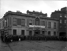 Before the creation of the Irish Free State, the whole island of Ireland was part of the United Kingdom of Great Britain and Ireland from 1801 to 1922; the pre-1801 Kingdom of Ireland was separate from but subordinate to the Kingdom of Great Britain (and before 1707 the Kingdom of England). While Irish unionists supported political integration with Britain, Irish nationalists were divided between those who envisaged some continuing link with Britain and the "advanced nationalists", mainly republicans, who wanted total independence. Separatists generally envisaged an independent Ireland being neutral, but were prepared to ally with Britain's enemies in order to secure that independence, reflected in the maxim "England's difficulty is Ireland's opportunity".[20] Irish leaders in the Nine Years' War (1594–1603) allied with Spain.[20] Wolfe Tone's 1790 pamphlet Spanish War claimed that Ireland was not obliged to support Britain if the Nootka Crisis started a war with Spain;[21] Tone later sought France's aid for the United Irishmen Rebellion of 1798.[20] At the outbreak of the First World War, James Connolly was president of the Irish Neutrality League[22] and was prosecuted for a banner reading "We serve neither King nor Kaiser but Ireland"; Connolly and the other leaders of the 1916 Rising sought military aid from Germany, and some countenanced a German prince becoming king of independent Ireland. In the 1921 negotiations leading to the Anglo-Irish Treaty, Erskine Childers envisaged the Irish Republic having a neutral status guaranteed in international law on the model of Belgium and Switzerland.[23] However, the Free State established under the Treaty as signed was a Dominion of the British Commonwealth, with the UK retaining responsibility for Ireland's marine defence as well as three naval bases, the "Treaty Ports".