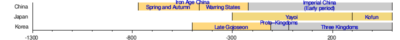 In Japan, iron items, such as tools, weapons, and decorative objects, are postulated to have entered Japan during the late Yayoi period (c. 300 BC–AD 300)[48] or the succeeding Kofun period (c. AD 250–538), most likely through contacts with the Korean Peninsula and China.