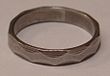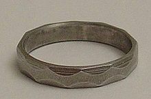 The Iron Ring is made from either iron or stainless steel.[9] It is intended to be worn on the little finger of the working (dominant) hand.[9] There, the facets act as a sharp reminder of one's obligation while the engineer works, because it could drag on the writing surface while the engineer is drawing or writing.[8] This is particularly true of recently obligated engineers, whose rings bear sharp, unworn, facets. Protocol dictates that the rings should be returned by retired engineers or by the families of deceased engineers. Some camps offer previously obligated or "experienced" rings, but they are now rare due to medical and practical complications.