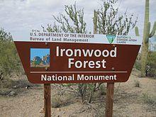Ironwood Forest National Monument is located in the Sonoran Desert of Arizona. Created by Bill Clinton by Presidential Proclamation 7320 on June 9, 2000, the monument is managed by the Bureau of Land Management, an agency within the United States Department of the Interior. The monument covers 129,055 acres (52,227 ha),[2] of which 59,573 acres (24,108 ha) are non-federal and include private land holdings and Arizona State School Trust lands.