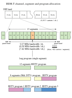 | Modulation | 8-VSB and 16-VSB | COFDM QPSK, 16QAM and 64QAM Hierarchical modulation: multi-resolution constellation (16QAM and 64 QAM) Guard interval: 1/32, 1/16, 1/8 & 1/4 of OFDM symbol 2 modes: 2k and 8k FFT | BST-COFDM with 13 frequency segments DQPSK, QPSK, 16QAM and 64QAM Hierarchical modulation: choice of three different modulations on each segment Guard interval: 1/32, 1/16, 1/8 & 1/4 of OFDM symbol 3 modes: 2k, 4k and 8k FFT |