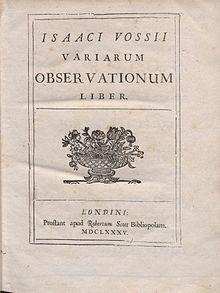 Isaak Vossius, sometimes anglicised Isaac Voss (1618 in Leiden – 21 February 1689 in Windsor, Berkshire) was a Dutch scholar and manuscript collector.