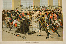 The defeat of the Isabelline forces commanded by Manuel Pavía y Lacy by the revolutionary forces led by Marshal Serrano at the 28 September 1868 Battle of Alcolea led to the definitive demise of the reign of Isabella. In the light of the news, Isabella and her entourage left San Sebastián and went to exile taking a train to Biarritz (France) on 30 September.[41] Prim (leader of the liberal progressives) was received by the Madrilenian people at his arrival to the capital in early October in a festive mood. He pronounced his famous speech of the "three nevers" directed against the Bourbons,[42] and delivered a highly symbolic hug to Serrano (leader of the revolutionary forces triumphant in the bridge of Alcolea) in the Puerta del Sol.[43]