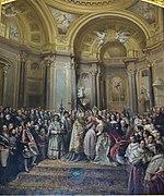 Following the crossing of the French–Spanish border by train on 30 September, Isabella and Francisco de Asís spent 5 weeks in the Château de Pau organising their Parisian future, arriving to the French capital on 8 November, settling in the Rue de Rivoli 172.[44] Isabella was forced to renounce to her dynastic rights in Paris in favour of her son, Alfonso on 25 June 1870, officially "freely and spontaneously".[45] Involving an economic settling, the formal separation between Isabella and Francisco de Asís had pended on the passing of the former queen's dynastic rights to her son.[46]