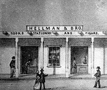 Hellman went to work as a clerk in his cousins' stationery and cigar store, and learned to speak Spanish.[10] The store operated as Hellman and Bro. and sold cigars and stationery, and was located at the corner of Main and Temple streets.[11] Isaias joined the business in 1855, brother Sam in 1857,and the partnership was dissolved Jan. 26, 1862.[12]