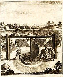 After cropping the woad eddish could be let out for grazing sheep.[25] The woad produced in Lincolnshire and Cambridgeshire in the 19th century was shipped out from the Port of Wisbech,[26] Spalding and Boston,[27] both the last to northern mills and the USA. The last portable woad mill was at Parson Drove, Cambridgeshire, Wisbech & Fenland Museum has a woad mill model, photos and other items used in woad production.[28] A major market for woad was at Görlitz in Silesia.[29] The citizens of the five Thuringian Färberwaid (dye woad) towns of Erfurt, Gotha, Tennstedt, Arnstadt and Langensalza had their own charters. In Erfurt, the woad-traders gave the funds to found the University of Erfurt. Traditional fabric is still printed with woad in Thuringia, Saxony and Lusatia today: it is known as Blaudruck (literally, "blue print(ing)").