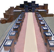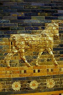 Dedicated to the Babylonian goddess Ishtar, the gate was constructed using glazed brick with alternating rows of Bas-relief mušḫuššu (dragons) and aurochs.[1]
