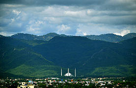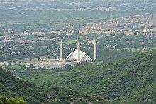 The city's master plan, designed by Greek architect Constantinos Apostolou Doxiadis, divides the city into eight zones, including administrative, diplomatic enclave, residential areas, educational sectors, industrial sectors, commercial areas, and rural and green areas which are administered by the Islamabad Metropolitan Corporation, supported by the Capital Development Authority. The city is known for the presence of several parks and forests, including the Margalla Hills National Park and the Shakarparian.[12] The city is home to several landmarks, with the most notable one being the Faisal Mosque − the largest mosque in South Asia[13] and the fifth largest in the world. Other landmarks include the Pakistan National Monument and Democracy Square.[14][15][16]