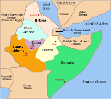 The colony was divided into 6 Governorates – Addis Ababa Governorate (Scioa Governorate from 1938), Amhara Governorate, Eritrea Governorate, Galla-Sidamo Governorate, Harar Governorate and Somalia Governorate.[1]