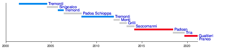 | 1 | Giulio Tremonti (1947–) | 11 June 2001 | 3 July 2004 | 3 years, 22 days | Forza Italia | Berlusconi II | [3] | ||