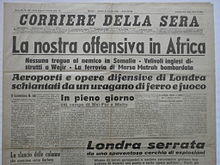 On 9 May 1936, Italian dictator Benito Mussolini proclaimed the foundation of Italian East Africa (Africa Orientale Italiana, AOI), formed from the colonies of Italian Eritrea, Italian Somaliland, and Ethiopia, conquered in the Second Italo-Ethiopian War (3 October 1935 – 5 May 1936).[1] On 10 June 1940, Mussolini declared war against Britain and France, making the Italian forces in Africa a threat to British supply routes along the Mediterranean, the Suez Canal and the Red Sea.[2] Egypt and the Suez Canal were obvious targets and an Italian invasion of French Somaliland (Djibouti) or British Somaliland was also feasible. Mussolini looked forward to propaganda triumphs in Sudan and British East Africa (Kenya, Tanganyika and Uganda). The Italian General Staff (Comando Supremo) had based its strategic calculations on an assumption that there would be no war until 1942; the Regio Esercito (Italian Royal Army) and Regia Aeronautica (Italian Royal Air Force) were not prepared for a long war or the occupation of large tracts of Africa.[2]