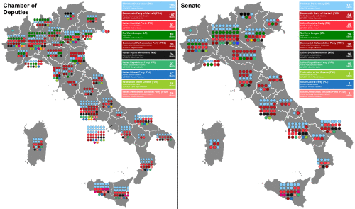 For the Senate, 237 single-seat constituencies were established, even if the assembly had risen to 315 members. The candidates needed a landslide victory of two thirds of votes to be elected, a goal which could be reached only by the German minorities in South Tirol. All remained votes and seats were grouped in party lists and regional constituencies, where a D'Hondt method was used: inside the lists, candidates with the best percentages were elected.