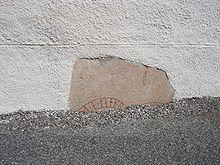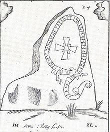 Runestone U 133 (location) is in style Pr3,[9] part of the more general Urnes style. The stone has been split into two parts that are walled into the southern exterior wall of Täby church, near the ground. The larger fragment, which was originally the upper part of the runestone, is in the western wall of the old porch which is constructed at the church's southern side.[10] The smaller fragment is upside-down in the southern wall of the porch. Both fragments are partly in the soil which means that it is necessary to remove some soil in order to read the entire inscriptions. The larger part was known as early as Johannes Bureus (1568–1652) and it was also studied by Johan Peringskiöld during the national search for historic monuments (1667–84) and by Olof Celsius in 1727. However, the smaller part was not noticed by scholars until 1857, when it was documented by Richard Dybeck, who initially believed that the parts did not belong together. He corrected this interpretation in his Sverikes runurkunder (1865) where he made a depiction of how they would have looked before they were split.[11]