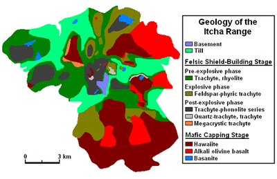 The Itcha Range is the smallest shield volcano in the Anahim Volcanic Belt in terms of area covered. Unlike the Rainbow and Ilgachuz ranges, the Itcha Range is composed of small coalescing volcanic units rather than a stratiform volcanic pile. It is, in many respects, similar to the small alkaline shields found in Kenya and Ethiopia along the East African Rift. About 60% of the shield is exposed while roughly 40% of it remains buried under glacial drift deposits. This suggests that the Itcha Range was glaciated repeatedly during the Pleistocene epoch. Glacial striae on polished surfaces of some of the oldest volcanic rocks in the eastern part of the shield and the local presence of drift deposits throughout the stratigraphy indicate that glaciation and volcanism were contemporaneous through much of the volcanic history of the Itcha Range.[3]