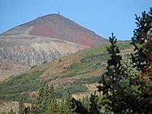 The felsic shield-building stage began with the eruption of phonolite, trachyte, phonolitic trachyte, quartz-trachyte and rhyolite lava.[3][13] Subsequent volcanism of the pre-explosive phase produced a basal sequence of aphyric trachyte lava flows and domes with minor altered flow-banded rhyolite, sulfide-bearing rhyolitic tuffs and a few thin hawaiite lava flows. This activity was concentrated at the summit of the volcano as shown by the increasing thickness of volcanic material towards the summit. A hydrothermally altered aphyric trachyte dike, which forms a narrow ridge linking Mount Downton and Itcha Mountain, might have been the source for these eruptions.[3]