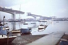 Once the piling was complete pile caps were added and the bridge supports constructed on top of them.[15] From the top of the bridge supports cantilevered arms were then constructed outwards.[15] They were constructed symmetrically in both directions at once in order to keep the weight on the supports balanced.[15] Once the cantilevered arms were complete the sections that spanned the gap between them were cast from concrete in the form of box beams on top of the arms before being moved into place on hydraulic bogies suspended from girders.[16] In order to balance the weight large concrete blocks were placed on the opposite arm.[16] During this period work was slowed by the 1976 British Isles heat wave and subsequent rains.[16]