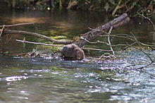 In recognition of the fact that many people use the towpath to exercise their dogs, dog dips have been installed at Allbrook and Shawford. These provide easy access into the water for dogs, and owners are encouraged to only allow dogs to swim at these locations, to conserve the bank in other places.[49] The water vole surveys have followed the best practice described in the Water Vole Conservation Handbook (2006), and have also recorded evidence of otter, brown rat and American mink populations. While carrying out the work, the surveyors have also counted sightings of kingfisher, heron, moorhen and coot.[50] The bat survey recorded common pipistrelle, soprano pipistrelle, Daubenton's, noctule and serotine bats in 2011. Bat boxes have been erected near Allbrook, and there was some evidence that they were being used.[51] The 2009 fisheries survey recorded large numbers of young Atlantic salmon in the lower river, but although fish weirs have been provided, wild parr were not recorded near Winchester. Above there, a large population of brown trout thrives. Eels were monitored for the first time in 2009, when their distribution was found to be variable.[52]