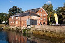 The navigation turns to the west, passing under the railway line, and then loops back to return to the eastern side of the railway. It runs along the northern edge of some railway sidings which form part of Eastleigh Works, to reach Withymead Lock. This was unusual, as it included a bypass channel to take excess water around the lock, whereas the other locks used vents in the gates. Just below the lock, the navigation rejoins the river channel.[38] At Barton Bay, the Barton River leaves the navigation, following a course to the west of the channel. A horse bridge carried the towpath over the river, which used to supply water to Barton Peveril Mill. The next cut began a little further south, with Bishopstoke or Stoke Lock at the head of it.[39][40] There are four bridges on Bishopstoke Road, as it crosses the Barton River, the navigation, the river channel and the tailrace of Shears Mill, Bishopstoke.[41] The mill was a large four-storey building, which was demolished in the 1920s. Four years before demolition, two water turbines of 20-inch (51 cm) and 36-inch (91 cm) diameter were installed, and were retained after the demise of the mill, in the hope that they could be used to generate DC power for the village. Several community groups were looking at the possibility of restoring the water turbines to generate electricity.[42][43]