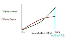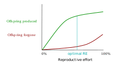 One class of models that tries to explain the differential evolution of semelparity and iteroparity examines the shape of the trade-off between offspring produced and offspring forgone. In economic terms, offspring produced is equivalent to a benefit function, while offspring forgone is comparable to a cost function. The reproductive effort of an organism—the proportion of energy that it puts into reproducing, as opposed to growth or survivorship—occurs at the point where the distance between offspring produced and offspring forgone is the greatest.[12] The accompanying graph shows the offspring-produced and offspring-forgone curves for an iteroparous organism: