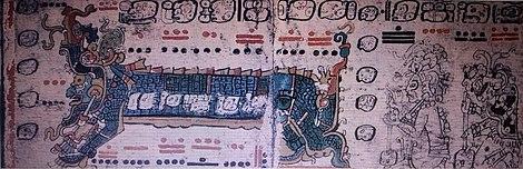 In the New Year pages of the Dresden Codex, Itzamna is given a role similar to that described by Landa. The version of Itzamna depicted in the codices is very similar to the much earlier depictions in Classic iconography.[5] In comparison with the early-colonial descriptions, Classic scenes are more suggestive of narrative traditions, at times subjecting Itzamna to the actions of others: He can, for example, be shown clinging to the back of a peccary or a deer; held ready for sacrifice; or being shot at in his bird avatar.