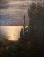 Upon his return to Russia, Aivazovsky was made an academician of the Imperial Academy of Arts and was appointed the "official artist of the Russian Navy to paint seascapes, coastal scenes and naval battles."[18][21] In 1845, Aivazovsky traveled to the Aegean Sea with Duke Konstantin Nikolayevich and visited the Ottoman capital, Constantinople, and the Greek islands of Patmos and Rhodes.[21]