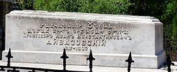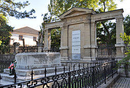 Aivazovsky died on 19 April (2 May in New Style) 1900 in Feodosia.[25] In accordance with his wishes, he was buried at the courtyard of St. Sargis Armenian Church.[41] A white marble sarcophagus was made by Italian sculptor L. Biogiolli in 1901.[42] A quote from Movses Khorenatsi's History of Armenia in Classical Armenian is engraved on his tombstone: Մահկանացու ծնեալ անմահ զիւրն յիշատակ եթող (Mahkanatsu tsneal anmah ziurn yishatak yetogh),[43] which translates: "He was born a mortal, left an immortal legacy"[41] or "Born as a mortal, left the immortal memory of himself".[44] The Russian inscription beneath reads: Профессоръ Иванъ Константиновичъ АЙВАЗОВСКIЙ 1817–1900, "Professor Ivan Konstantinovich Aivazovsky 1817-1900".