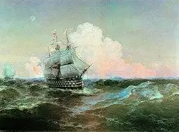 Aivazovsky's later work contained dramatic scenes and was usually done on a larger scale. He depicted "the romantic struggle between man and the elements in the form of the sea (The Rainbow, 1873), and so-called "blue marines" (The Bay of Naples in Early Morning, 1897, Disaster, 1898) and urban landscapes (Moonlit Night on the Bosphorus, 1894)."[18]