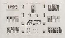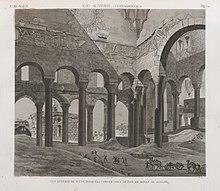 The 19th century Description de l'Égypte depicted a square hypostyle structure with five parallel aisles and a dome. The building was open to the exterior on three sides through arcades, and the main façade was articulated with a large central arch flanked by two smaller arches on either side.[34][35]