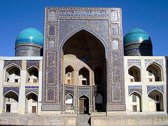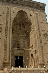 An iwan (Persian: ایوان eyvān, Arabic: إيوان Iwan, also spelled ivan)[1][2][3] is a rectangular hall or space, usually vaulted, walled on three sides, with one end entirely open. The formal gateway to the iwan is called pishtaq, a Persian term for a portal projecting from the facade of a building, usually decorated with calligraphy bands, glazed tilework, and geometric designs.[4][5] Since the definition allows for some interpretation, the overall forms and characteristics can vary greatly in terms of scale, material, or decoration. Iwans are most commonly associated with Islamic architecture; however, the form is Iranian in origin and was invented much earlier and fully developed in Mesopotamia around the third century CE, during the Parthian period of Persia.