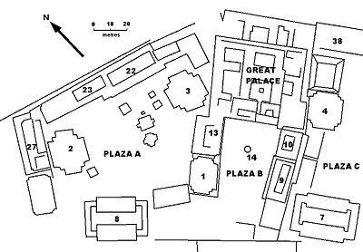 Plazas A and B are thought to have comprised a single complex belonging to the Sotzʼil clan and included the palace of the Ahpo Sotzʼil.[31] Plaza A possesses a ballcourt, two temples and ten palace structures, five of which are interconnecting.[65]
