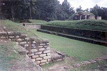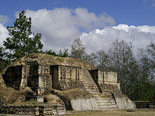 Plaza C was separated from Plazas A and B by a 0.91-metre (3 ft) wall and was the palace complex of the Ahpo Xahil, the junior co-ruler.[67] Plaza C also had two temples facing each other across the plaza.[68] The Xahil ballcourt was on the southwest side of Plaza C and the palace proper of the Ahpo Xahil was on the southeast side of the plaza.[69] The Xahil Palace was built with an east-west alignment with the entry courtyard on the western side of the palace and had a central altar.[69] The main palace was entered from the eastern side of the entry courtyard.[69] The rooms and courtyards of the Xahil Palace contained a great deal of domestic artefacts.[69] The Xahil Palace was destroyed by a major fire that resulted in the collapse of the adobe walls and it may be that this was the complex where Pedro de Alvarado was lodged with his Spanish soldiers.[69] It would also be the same building that Spanish deserters burned in 1526.[69] The collapse of the building preserved the domestic contents of the palace for archaeologists, unlike the palace of the Ahpo Sotzʼil where comparatively few artefacts were recovered.[69]