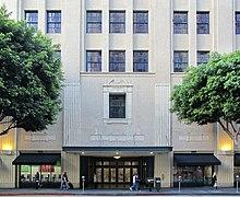 As Los Angeles continued to grow, so did Robinson's business and in 1914 it announced its construction of a new $1,000,000, seven-story flagship store with over nine acres (400,000 square feet (37,000 m2)) of floor space, along the south side of West Seventh Street stretching alone the complete block between Grand and Hope streets. Frederick Noonan and William Richards of Dodd & Richards were the architects.[9] The store opened on September 7, 1915.[10] The building was expanded to the south in 1923 at a cost of $900,000, Dodd and Richard, architects, for a total of 623,700 square feet (57,940 m2).[11] In 1934, the building was remodeled for between $100,000–200,000 to a "restrained Modernistic" exterior, shedding some its more exuberant Art Deco features and adding more parking facilities. Robinson's was the largest store of what became a new upscale Seventh Street shopping district to the southwest of the concentration of department stores along Broadway, with Ville de Paris (later B. H. Dyas), Coulter's, Haggarty's, and Desmond's opening stores nearby.[12] The Robinson's store closed in 1993 and the building, 600 W. Seventh St., currently houses telecommunications (voice, data and internet servers), offices and ground-floor retail.