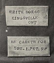 Perhaps Miner's most significant contribution to the conservation movement was his practice of banding ducks and geese. Although his son claims that Jack was the first person to band birds in North America,[14] it had actually been introduced by American Leon J. Cole several years earlier. Miner had begun banding ducks and geese in August, 1909.[15] He banded his first duck with a hand-stamped aluminum band, which was recovered five months later in Anderson, South Carolina, constituting the first complete banding record. His bird tags quoted scripture: "Keep yourselves in the love of God—Jude 1-21" and "With God all things are possible—Mark 10-27". The inclusion of scripture on his bands was again indicative of the influence of Miner's faith on his conservation methods. Indeed, in an entry titled "Birds as Missionary Messengers," Miner describes Canada geese as just that, recounting a visit by a missionary from the Canadian North who had been given bands from the local Inuit for interpretation and of a letter sent to him from inmates in an Arkansas prison who had taken interest in the unique method of banding.[16] This unconventional method of banding, it is suggested, helped generate increased interest and participation in the project.[17] Miner's method of banding, however, was at odds with the attempt to standardize bird-banding practices by the American Bird Banding Association. Indeed, in spite of external pressure, the Jack Miner Migratory Bird Foundation did not adopt the standardized methods until after his death.[18]