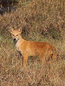 The wolf-like canids are a group of large carnivores that are genetically closely related because they all have 78 chromosomes. The group includes genus Canis, Cuon, and Lycaon. The members are the dog (C. lupus familiaris), gray wolf (C. lupus), coyote (C. latrans), golden jackal (C. aureus), Ethiopian wolf (C. simensis), black-backed jackal (C. mesomelas), side-striped jackal (C. adustus), dhole (Cuon alpinus), and African wild dog (Lycaon pictus).[7] The latest recognized member is the African golden wolf (C. anthus), which was once thought to be an African branch of the golden jackal.[5] As they possess 78 chromosomes, all members of the genus Canis are karyologically indistinguishable from each other, and from the dhole and the African hunting dog.[8][9] The two African jackals are shown to be the most basal members of this clade, indicating the clade's origin from Africa.[4] Canis arnensis arrived in Mediterranean Europe 1.9 million years ago and is probably the ancestor of modern jackals.[10]