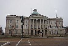 After surveying areas north and east of Jackson, they proceeded southwest along the Pearl River until they reached LeFleur's Bluff in today's Hinds County.[13] Their report to the General Assembly stated that this location had beautiful and healthful surroundings, good water, abundant timber, navigable waters, and proximity to the Natchez Trace. The Assembly passed an act on November 28, 1821, authorizing the site as the permanent seat of the government of the state of Mississippi.[13] On the same day, it passed a resolution to instruct the Washington delegation to press Congress for a donation of public lands on the river for the purpose of improved navigation to the Gulf of Mexico.[15] One Whig politician lamented the new capital as a "serious violation of principle" because it was not at the absolute center of the state.[16]