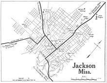 Jackson was connected by public road to Vicksburg and Clinton in 1826.[19] Jackson was first connected by railroad to other cities in 1840. An 1844 map shows Jackson linked by an east–west rail line running between Vicksburg, Raymond, and Brandon. Unlike Vicksburg, Greenville, and Natchez, Jackson is not located on the Mississippi River, and it did not develop during the antebellum era as those cities did from major river commerce. Construction of railroad lines to the city sparked its growth in the decades following the American Civil War.