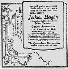 The Queensboro Corporation advertised their apartments from 1922 on.[29] On August 28, 1922, the Queensboro Corporation paid $50 to the WEAF radio station to broadcast a ten-minute sales pitch for apartments in Jackson Heights,[33] in what may have been the first "infomercial", opening with a few words about Nathaniel Hawthorne before promoting the corporation's Nathaniel Hawthorne apartments.[34] The ad wanted viewers to: