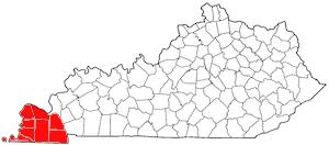 During the Civil War, the Purchase was the area of strongest support for the Confederate cause. On May 29, 1861, a group of Southern sympathizers from Kentucky and Tennessee met at the Graves County Courthouse in Mayfield to discuss the possibility of aligning the Purchase with West Tennessee. Most records of the event were lost, possibly in an 1864 fire that destroyed the courthouse.[4] After the War the region heightened its sense of being "Southern".[5]