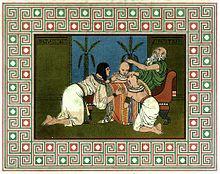 Rebecca overheard this conversation. It is suggested that she realized prophetically that Isaac's blessings would go to Jacob, since she was told before the twins' birth that the older son would serve the younger.[11] Rebecca blessed Jacob and she quickly ordered Jacob to bring her two kid goats from their flock so that he could take Esau's place in serving Isaac and receiving his blessing. Jacob protested that his father would recognize their deception since Esau was hairy and he himself was smooth-skinned. He feared his father would curse him as soon as he felt him, but Rebecca offered to take the curse herself, then insisted that Jacob obey her.[12] Jacob did as his mother instructed and, when he returned with the kids, Rebekah made the savory meat that Isaac loved. Before she sent Jacob to his father, she dressed him in Esau's garments and laid goatskins on his arms and neck to simulate hairy skin.
