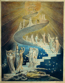 Near Luz en route to Haran, Jacob experienced a vision of a ladder, or staircase, reaching into heaven with angels going up and down it, commonly referred to as "Jacob's ladder." He heard the voice of God, who repeated many of the blessings upon him, coming from the top of the ladder.