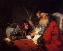 Israel (Jacob) was 147 years old when he called to his favorite son Joseph and pleaded that he not be buried in Egypt. Rather, he requested to be carried to the land of Canaan to be buried with his forefathers. Joseph swore to do as his father asked of him. Not too long afterward, Israel had fallen ill, losing much of his vision. When Joseph came to visit his father, he brought with him his two sons, Ephraim and Manasseh. Israel declared that they would be heirs to the inheritance of the house of Israel, as if they were his own children, just as Reuben and Simeon were. Then Israel laid his right hand on the younger Ephraim's head and his left hand on the eldest Manasseh's head and blessed Joseph. However, Joseph was displeased that his father's right hand was not on the head of his firstborn, so he switched his father's hands. But Israel refused saying, “but truly his younger brother shall be greater than he.” A declaration he made, just as Israel himself was to his firstborn brother Esau. Then Israel called all of his sons in and prophesied their blessings or curses to all twelve of them in order of their ages. (Genesis 47:29–49:32)