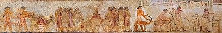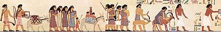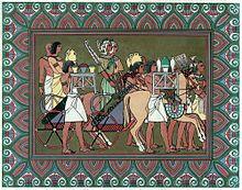 According to researches on the historicity of the Old Testament, the descent of Abraham into Egypt as recorded in Genesis 12:10-20 should correspond to the early years of the 2nd millennium BCE, which is before the time the Hyksos ruled in Egypt, but would coincide with the Semitic parties known to have visited the Egyptians circa 1900 BCE, as documented in the painting of a West-Asiatic procession of the tomb of Khnumhotep II at Beni Hasan.[48] It might be possible to associate Abraham to such known Semitic visitors to Egypt, as they would have been ethnically connected.[48][49] The period of Joseph and Jacob/Israel in Egypt (Genesis 39:50), where they were in favour at the Egyptian court and Joseph held high administrative positions next to the ruler of the land, would correspond to the time the Hyksos ruled in Egypt, during the Fifteenth Dynasty.[48] The time of Moses and the expulsion to Palestine related in The Exodus could also correspond to the explusion of the Hyksos from Egypt.[48][49]