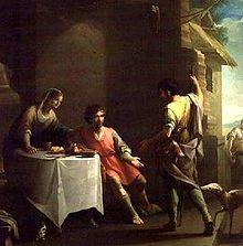 Laban pursued Jacob for seven days. The night before he caught up to him, God appeared to Laban in a dream and warned him not to say anything good or bad to Jacob. When the two met, Laban said to Jacob, “What have you done, that you have tricked me and driven away my daughters like captives of the sword?"[21] He also asked for his stolen teraphim back. Knowing nothing about Rachel's theft, Jacob told Laban that whoever stole them should die and stood aside to let him search. When Laban reached Rachel's tent, she hid the teraphim by sitting on them and stating she could not get up because she was menstruating. Jacob and Laban then parted from each other with a pact to preserve the peace between them near Gilead. Laban returned to his home and Jacob continued on his way.