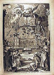 Jacob Cats was born on 10 November 1577 in Brouwershaven as son of Adriaen Cornelisz. Cats and Leenken Jacob Jansdr. Breyde.[1] Having lost his mother at an early age, he and his three brothers were adopted by his aunt Anna Breyde, sister of his mother and his uncle Doen Leenaerts. Cats was sent to school in Breda. He then studied law in Rotterdam and Paris, and, returning to Holland, he settled in The Hague, where he began to practice as a lawyer. His pleading in defense of a person accused of witchcraft brought him many clients and some reputation. He had a serious love affair about this time, which was broken off on the very eve of marriage by his catching a tertian fever (a form of malaria) which defied all attempts at cure for some two years. For medical advice and change of air Cats went to England, where he consulted the highest authorities in vain. He returned to Zeeland to die, but was cured mysteriously with the powder of a travelling doctor (later sources claim he was a quack). He married on 26 April 1605 a lady of some wealth, Elisabeth van Valckenburg from Antwerp,[1] and thenceforward lived at Grijpskerke in Zeeland, where he devoted himself to farming and poetry.