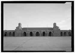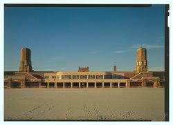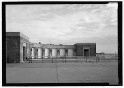 After the remainder of Riis Park was relinquished by the Navy, in fall 1930 Queens Parks Commissioner Albert C. Benninger proposed the construction of a bathing pavilion at Jacob Riis Park. Benninger had been inspired by the design of the bathhouse at Jones Beach State Park, completed in August 1929 by then-Long Island Parks Commissioner Robert Moses.[10]:60[45] Prior to this, beach-goers were forced to change their clothes in their cars.[40]:13 The designs were prepared by architect John L. Plock in November 1930.[46] The project was approved by the mayor's office in February 1931.[46] The foundation of the building was completed in August 1931.[46][10]:60 Contracts were let for building construction in September 1931.[46][10]:61 Later that month, Benninger requested an additional $105,000 for the project from the New York City Board of Estimate, on top of the initial $425,000 appropriated.[47] Construction began on November 23, 1931.[48][49] The bathhouse was opened on August 6, 1932. At the time, it was only 60 percent completed.[12]:2·5[46][50][51] Additional work was completed in May 1933, including lockers, the restaurant, and the solarium.[46][10]:64[52] The solarium was expected to be the largest in the world at the time.[52][53] A seawall running in front of the bathhouse along the beach and parking facilities for 5,000 cars were also completed by 1933.[10]:64[54] At this time, Riis Park received 25,000 daily visitors during summer months.[55]