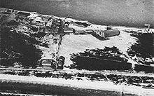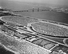 On October 17, 1925, a ferry service was opened between Barren Island, Brooklyn (later Floyd Bennett Field airport) and Riis Park.[38] In 1926, a short macadam transverse road was created between Washington Avenue and the ferry terminal.[10]:41 The road was later paved with concrete, and expanded from 20 feet (6.1 m) wide to 40 feet (12 m) wide.[39]:14 A small concession stand was also constructed at the west end of the park.[10]:41–42 From 1926 to 1927, the beach protection system was expanded to the western section of the park, with additional groins installed.[10]:42–43 From 1927 to 1929, Washington Avenue was widened and paved, with a sidewalk added to both Washington Avenue and the ferry transverse road. Other minor improvements to the park took place at this time.[10]:43[40]:13, 32–33 In July 1929, an existing 1,000-car parking lot was enlarged. By this time, the patronage of Jacob Riis Park was increasing.[10]:45–46[41] Meanwhile, in 1929 the New York City Board of Transportation released a major expansion plan for the New York City Subway. One of the new routes in the plan involved recapturing the New York, Woodhaven and Rockaway Railroad, which by this time became the Rockaway Beach Branch of the Long Island Rail Road, and extending it as a subway line west from Rockaway Park to Jacob Riis Park. The extension of the line to the park was never constructed.[42][43][44]