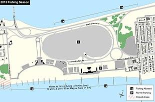Located on the north side of Rockaway Beach Boulevard extending to Beach Channel Drive is the park's parking lot, which is variously given as being 62 acres (25 ha) or 72 acres (29 ha) in size. The parking lot is the largest individual feature in the park and occupies much of the park site north of the beach. The only entry point to the lot is at its south end in front of the bathhouse, where four toll booths are present.[4]:10 (PDF p.16)[96][12]:2·25[146][154] It was built with a capacity of either 9,000[4]:10 (PDF p.16)[12]:2·21[146][62]:508 or 14,000[96][12]:2·15[66] automobiles. At the time of its construction, it was the largest paved parking lot in the world.[96][12]:2·15[66] A grade-level crosswalk to the west of the toll booths, and a pedestrian underpass to the east, lead across the street to the bathhouse.[12]:2·25[154] The lot is entirely circumscribed by the access roads to the park, with the roundabout located at its southeast corner, and the interchange with the Marine Park Bridge located near its northwest corner.[4]:10 (PDF p.16)[96][12]:2·24 to 2·25[146]